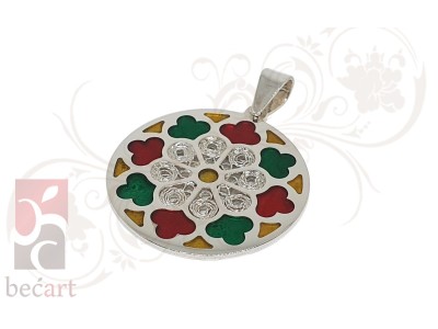 Srebreni privjesak sa motivom rozete sa sarajevske katedrale iz kolekcije "ColorUp". Privjesak je izrađen u kombinaciji tradicionalne tehnike filigrana sa detaljima u boji koji mu daju vrlo moderan i atraktivan izgled. Može se naručiti u boji srebra ili sa pozlatom.