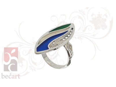 Srebreni prsten Talasi iz kolekcije "ColorUp". Prsten je izrađen u kombinaciji tradicionalne tehnike filigrana sa detaljima u boji koji mu daju vrlo moderan i atraktivan izgled. Može se naručiti u boji srebra ili sa pozlatom.