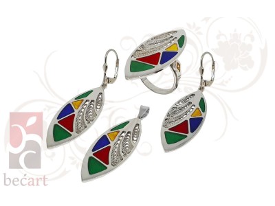 Srebreni set Polja iz kolekcije "ColorUp". Set je izrađen u kombinaciji tradicionalne tehnike filigrana sa detaljima u boji koji mu daju vrlo moderan i atraktivan izgled. Može se naručiti u boji srebra ili sa pozlatom. U setu se nalazi privjesak, naušnice i prsten.